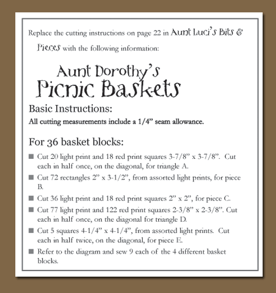 The Sweetheart Pincushion pattern in Ella's Home Place (page 17) needs to be reduced to 74% for correctly sized templates. |